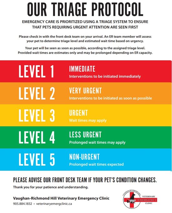 We are an emergency clinic, which means we run in a similar manner to a human emergency room and do not book appointment times. We function using the triage system, so you will be asked questions based on your pet’s problem and past history when you get to the clinic. Calling ahead to alert us of your pet’s condition will better help us triage them more efficiently. Due to the nature of our work, it is not possible to give accurate wait times at any time.